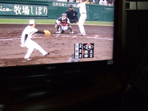 →ブログカウンター「15000」切り番ゲット ↑先日(2009年5月28日)テレビの阪神対埼玉西武戦で偶然次のような状況でカメラで切り取ることができた。 2回表阪神タイガースのピッチャー安藤が西武ライオンズ打者涌井の場面で走者2塁、得点2対2…