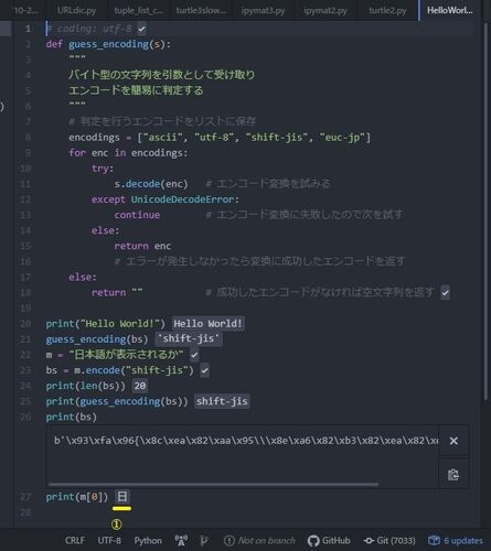 Hydrogen(Shift + Enter)文字化けせず(①) Atom(Alt + R)で結果が文字化けしている様子(②) 以前からHydrogenで日本語の表示はうまくいっていたがAtom(Alt + R)で日本語を表示させると文字化けが起きてしまっていた。何が原因かわからなかったのでアイキ…