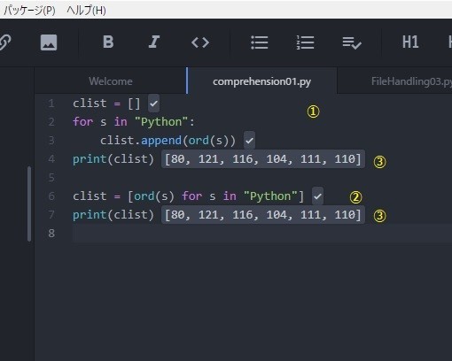 2019-10-06 リスト内包表記1 通例処理とリスト内包処理の例 ListComprehension1リスト内包表記文字列の各文字を元として、文字コード相当の数値に変換してリストを作る。for文を使った例は①です。この処理をリスト内包表記使って書き表したのが②です。結果は③のようになります。 ←人気ブログランキングに参加しています。ポチっと1票を!
